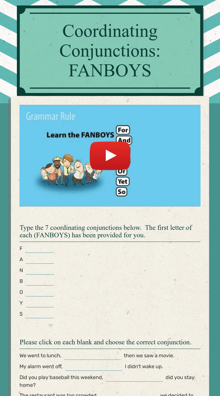 Fill in with the most appropriate fanboys. Conjunctions online worksheet for a2. Children carried out after learning about coordinating conjunctions using the fanboys acroynym. Use these differentiated activity / activities sheets to help your children develop their understanding of coordinating conjunctions (fanboys). Are you looking to teach your children coordinating conjunctions?